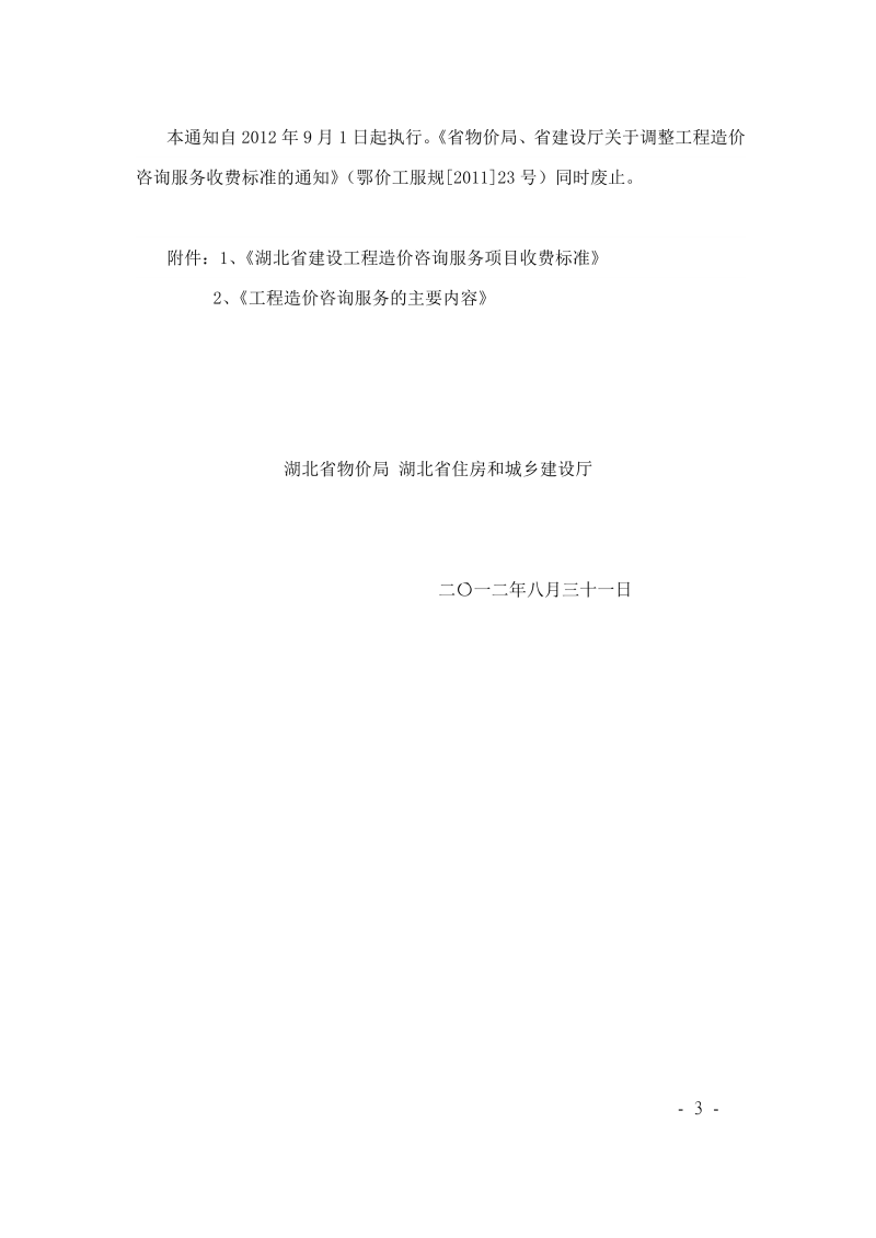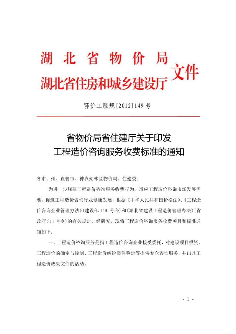 省物价局省住建厅关于印发工程造价咨询服务收费标准的通知 鄂价工服规【2012】149号